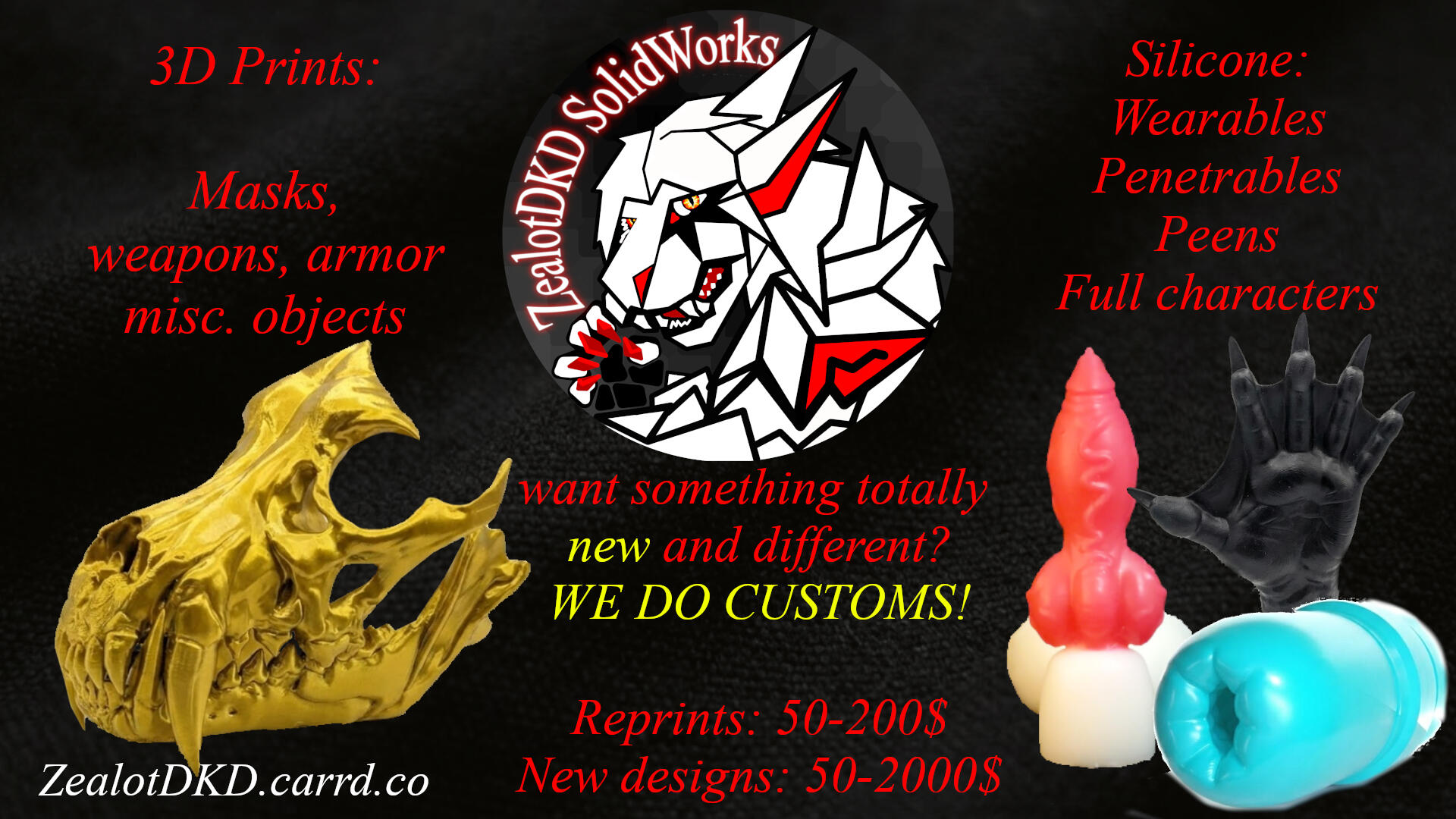 3D print and Silicone shop creating Costuming parts, nicknacks, adult toys, prosthetics and custom shells for domestic robots.